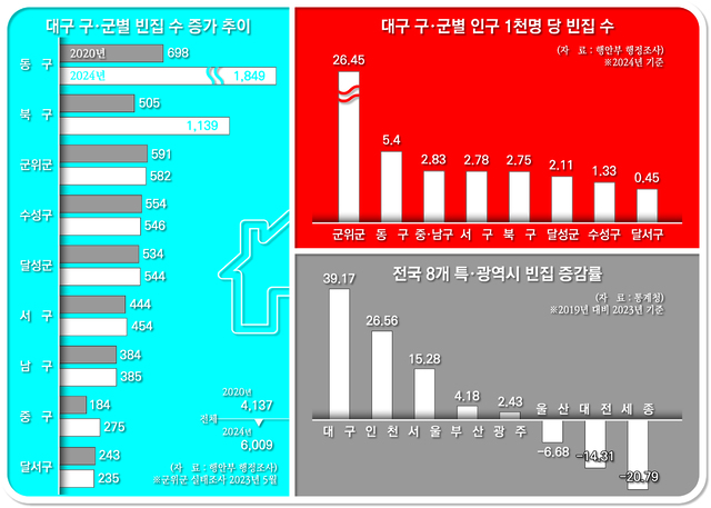 2024년 조사 기준으로 △동구 1천849채 △북구 1천139채 △군위군 582채 △수성구 546채 △달성군 544채 △서구 454채 △남구 385채 △중구 275채 △달서구 235채 순이다. 인구 1천 명당 빈집 수는 △군위군 26.45채 △동구 5.4채 △중·남구 2.83채 △서구 2.78채 △북구 2.75채 △달성군 2.11채 △수성구 1.33채 △달서구 0.45채 순이었다.